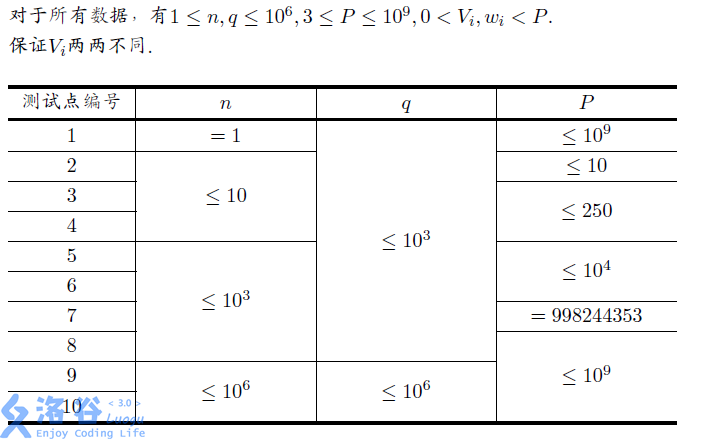 第一行三个整数 n,q,Pn, q, Pn,q,P,含义见问题描述。