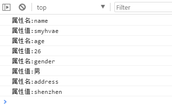 解释:对象中有几个属性,循环体就会执行几次。每次执行时,会将对象中的每个属性的 属性名 赋值给变量。