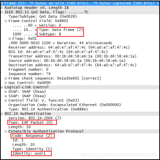 Here is an EAP-Response frame(115 in the above).Note that Type 0 EAP packet type is “0” & Code is 2 indicating it is a EAP-Reseponse frame. Also note the Identity is sent as cleartext (user1 in this capture).