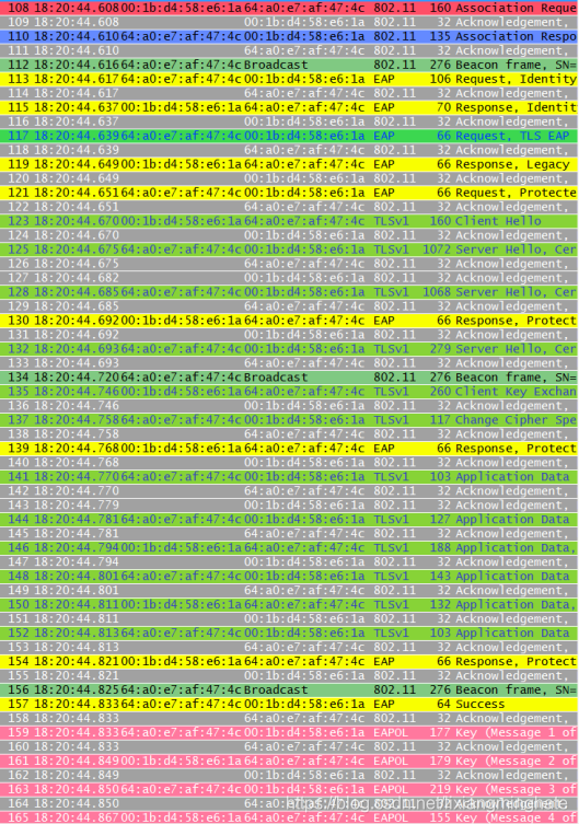 Here is the “EAP-Success” frame(no 157). Note that EAP packet type 0 indicating it is normal EAP frame & Code is set to 3 indicating it is a EAP-Success frame.