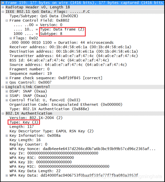 Here is an “EAPOL-Key” exchange frame (no 159). Note that EAP packet type 3 indicating it is a EAPOL-Key exchange frame.