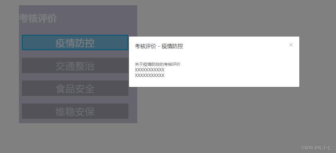 这是一个关于用户考核评价的前端交互组件实现。通过遍历userList数组展示不同考核项目的标签,用户点击后会触发changeClick方法,打开弹窗显示具体评价内容。弹窗内含有评价的详细信息,并提供关闭功能。