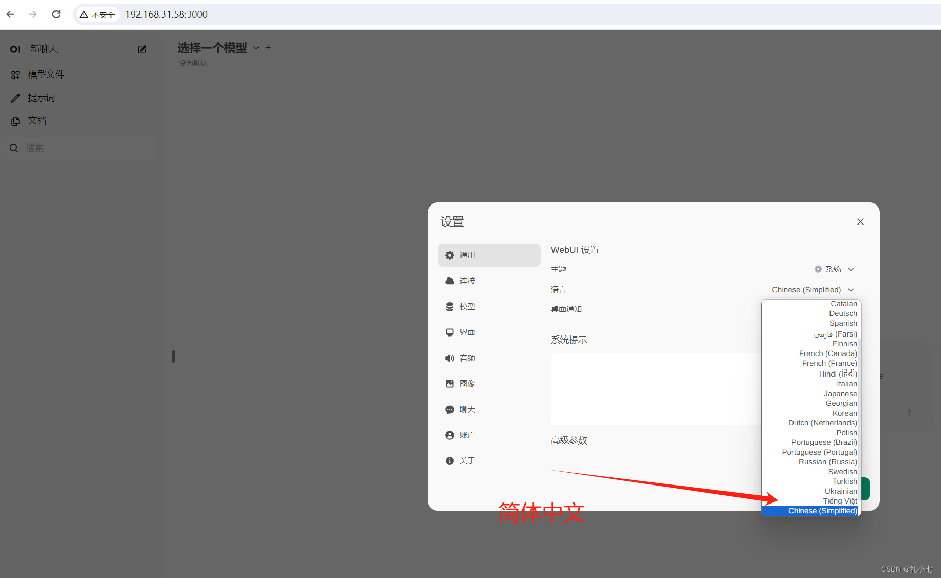浏览器访问【本地IP:3000】右上角设置,找到language设置,找到简体中文;