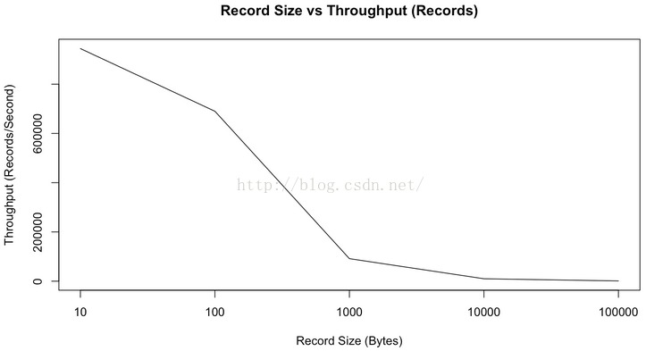 初步结论:上面的所有测试都基于短消息(payload100字节),而正如上文所说,短消息对Kafka来说是更难处理的使用方式,可以预期,随着消息长度的增大,records/second会减小,但MB/second会有所提高。下图是records/second与消息长度的关系图。(我们消息长度大约:650~800字节/每条订单)