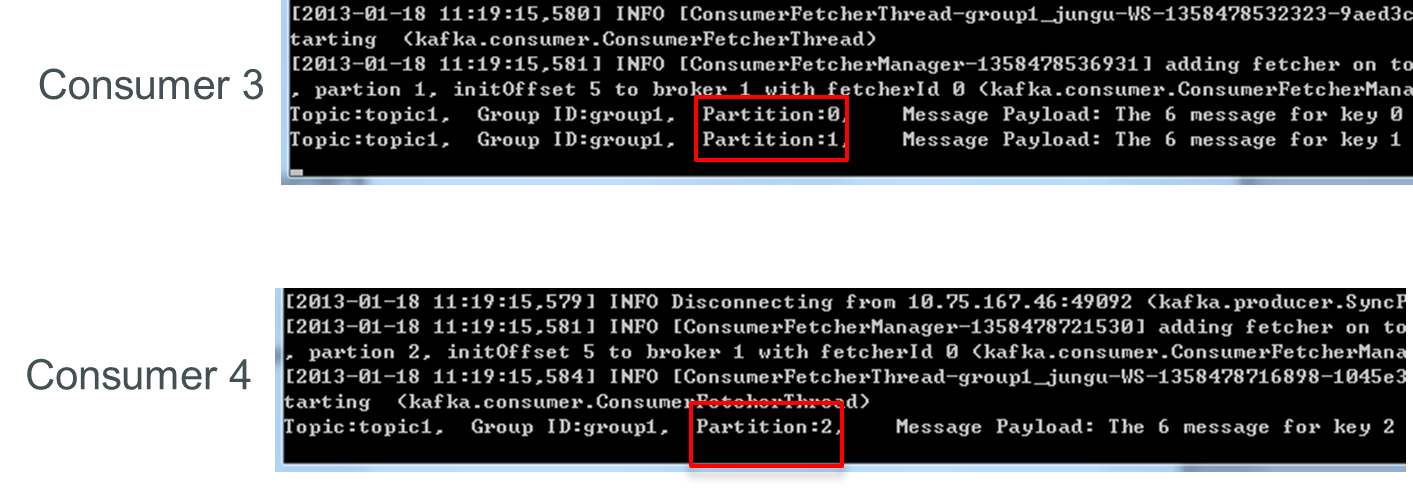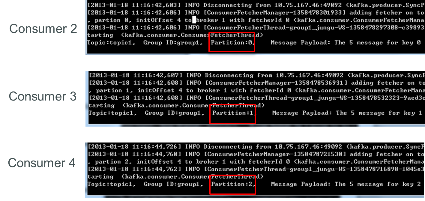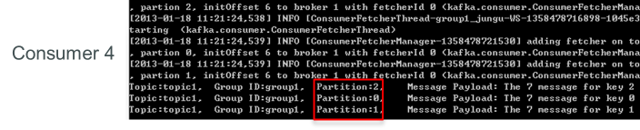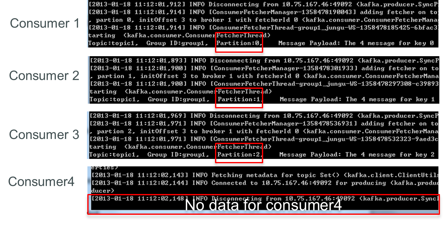 再增加一个Consumer(consumer4)后,其中3个Consumer可分别消费一个Partition的数据,另外一个Consumer(consumer4)不能消费topic1的任何数据。