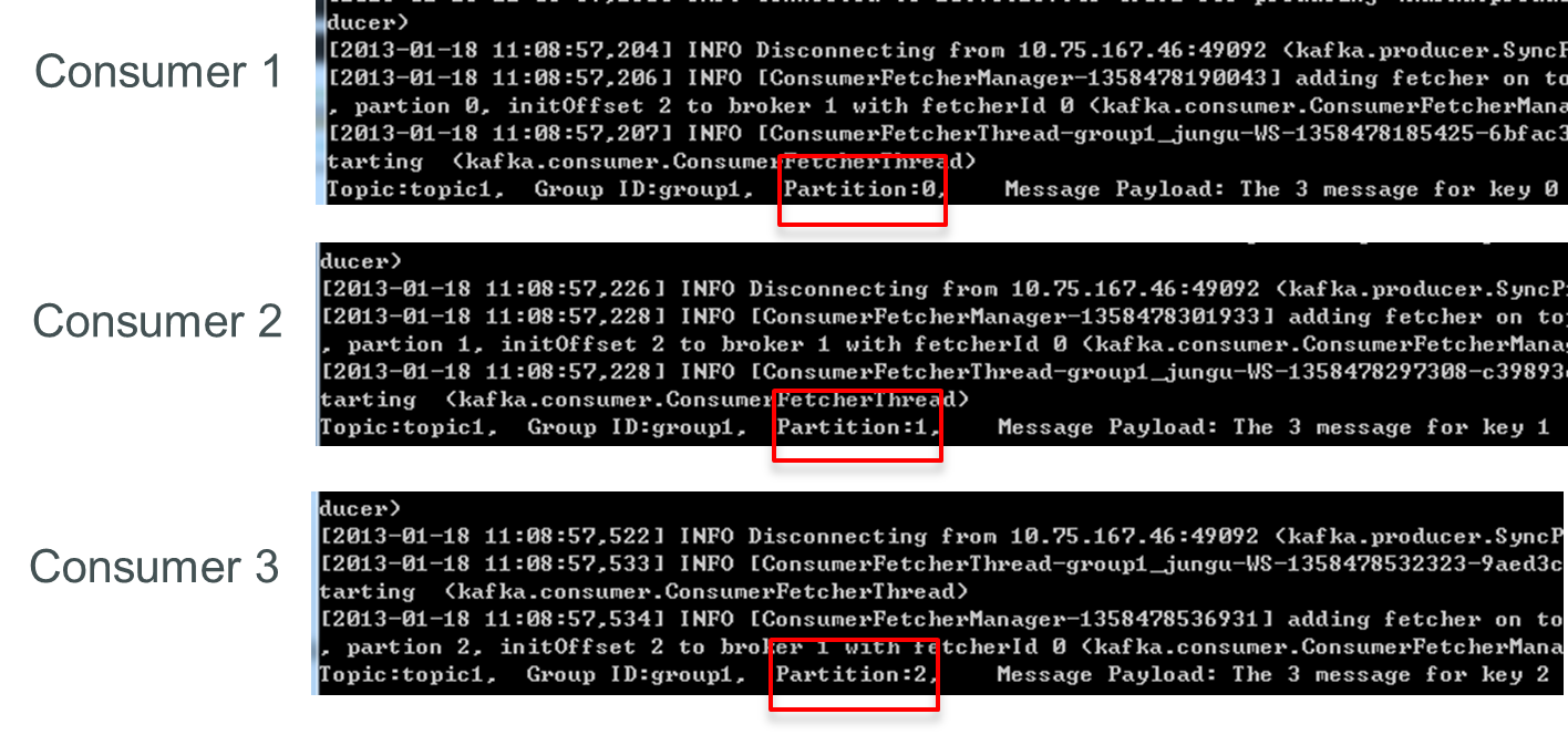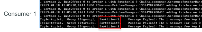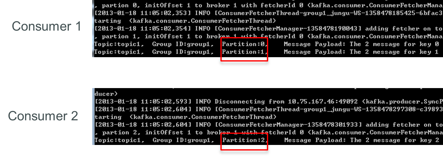 增加一个Consumer(consumer2)后,其中一个Consumer(consumer1)可消费2个Partition的数据(Partition 0和Partition 1),另外一个Consumer(consumer2)可消费另外一个Partition(Partition 2)的数据。