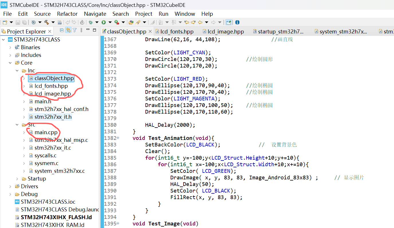 主要的文件4个:main.cpp;classObject.hpp;lcd_confs.hpp;lcd_image.hpp。直接添加相应文件到图示目录并复制相应文件的代码即可编译运行。