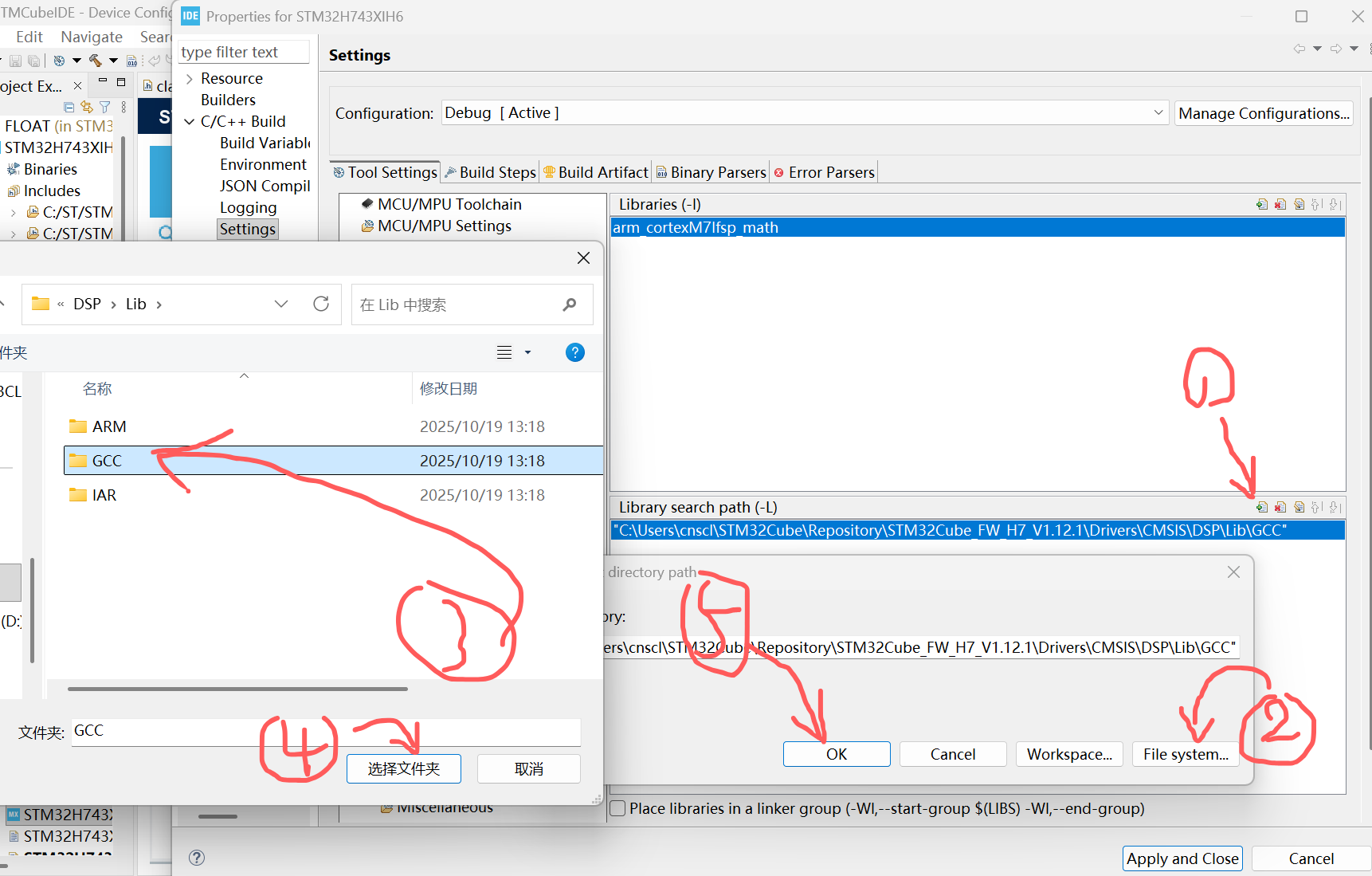 上面框里新建项:arm_cortexM7lfsp_math 下面框里新建项:"C:\Users\cnscl\STM32Cube\Repository\STM32Cube_FW_H7_V1.12.1\Drivers\CMSIS\DSP\Lib\GCC"这一项需要在文件系统里选,注意是选择GCC文件夹。如下图所示: