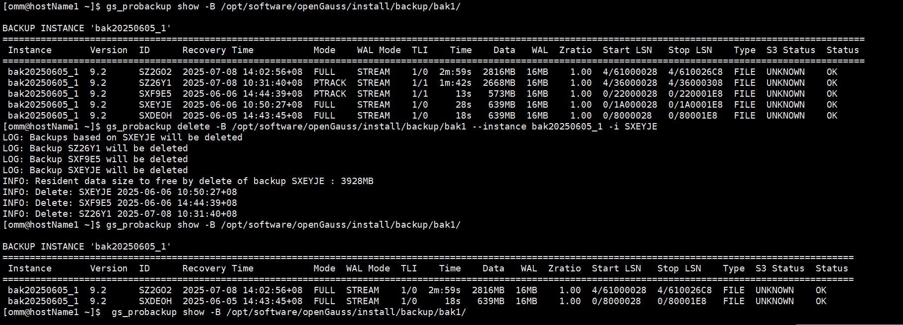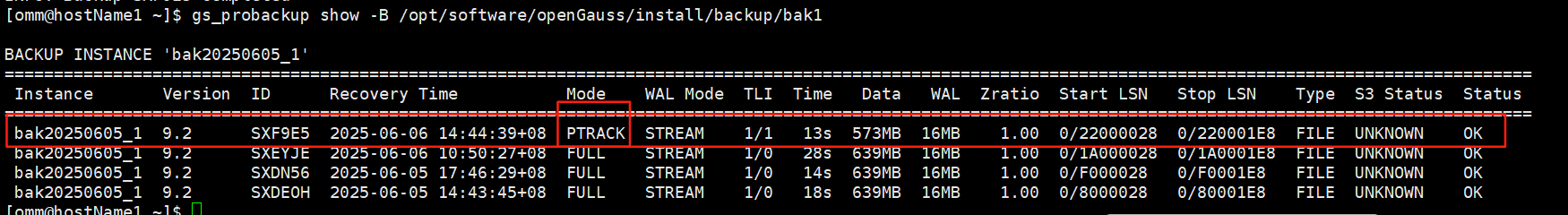 [omm@hostName1 ~]$ gs_probackup backup -B /opt/software/openGauss/install/backup/bak1 --instance bak20250605_1 -b PTRACK