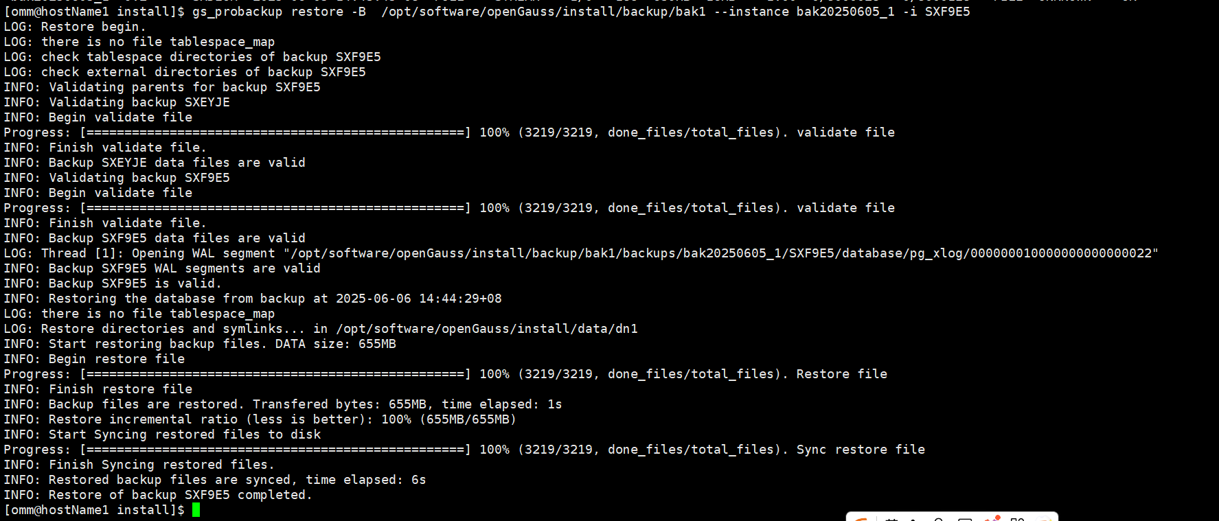 #gs_probackup validate -B /opt/software/openGauss/install/backup/bak1 --instance bak20250605_1 -i SXDEOH