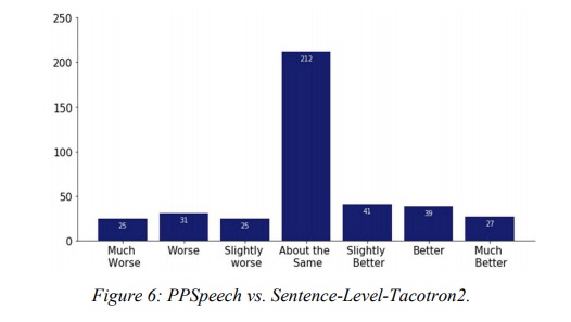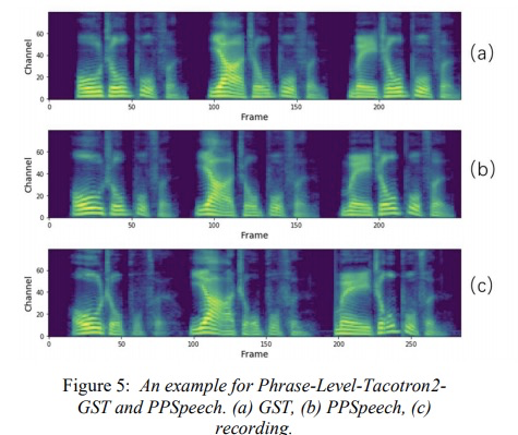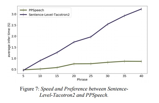 本文先对比使用phrase级别的合成效果。由table 1显示,本文ppspeech的MOS值最高,因此添加context encoder和acoustic encoder模块具有提高合成音频自然度的效果。接下来图4和图5分别对比context encoder和acoustic encoder,添加后的语谱图与原始录音更一致。图6和图7是和句子级别系统进行合成音质和合成速度对比,图6显示本系统和句子级别合成质量几乎相等,图7显示合成速度随着句子长度几乎不变。