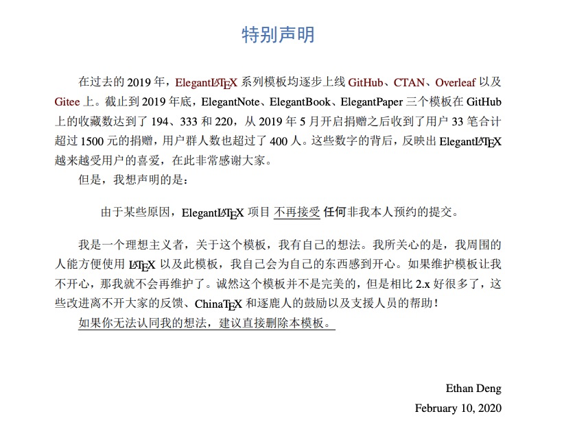 ElegantLaTeX 成立于 2013 年,由 Ethan Deng 和 Liam Huang 共同发起。最早的模板为 ElegantNote。写这个模板的目的是简化使用 LaTeX 记录笔记的工作。后来几经改版和沉沦,ElegantNote 已经重新设计,ElegantBook 在原 ElegantNote 的基础上更加完善,在去年也推出了第三个模板:ElegantPaper。模板在更新,但我们的宗旨不变:设计出更加美观的 LaTeX 模板!