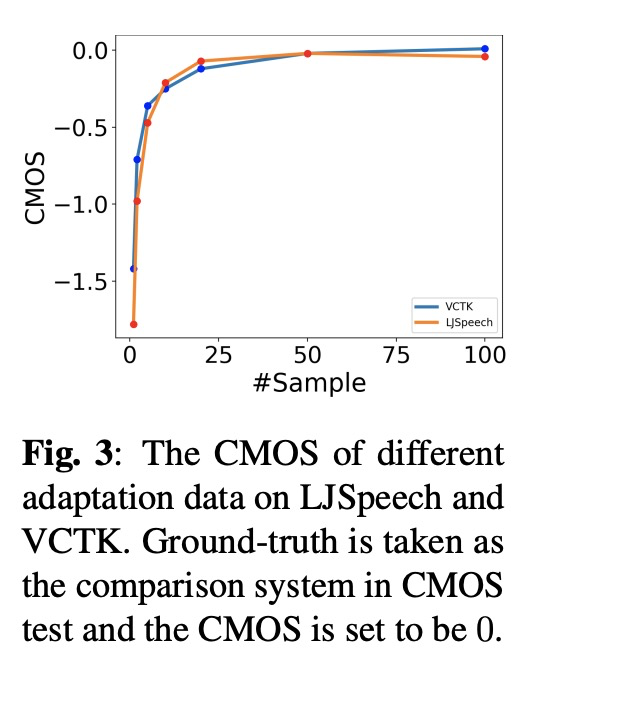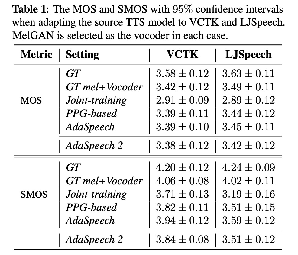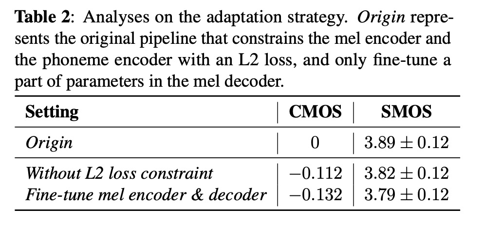 本文对比以往的几种方案,其中MOS和相似度SMOS对比,adapspeech2接近adapspeech的方案。table 2是显示使用l2 loss和只微调mel decoder的作用。图3显示使用数据量对结果的影响。