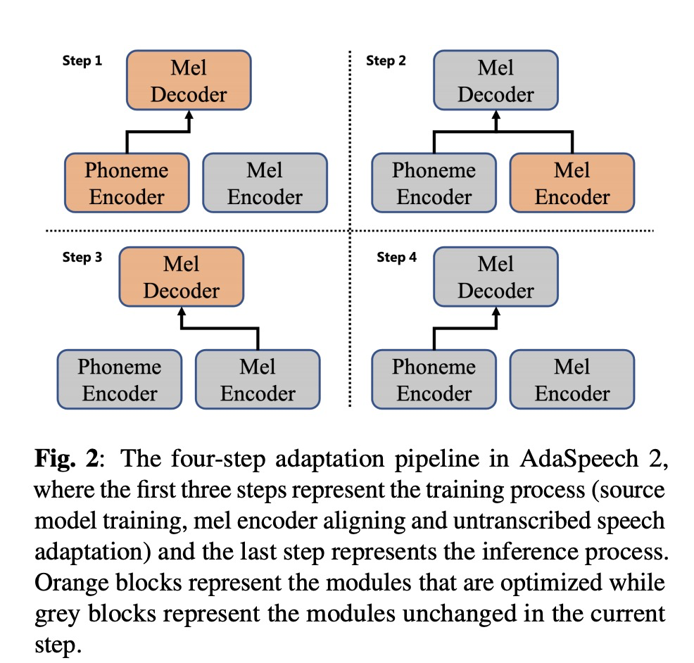 本文系统主体架构是AdaSpeech,在此基础上添加mel encoder,具体如图1所示。整个的流程如图2所示,第一步,训练AdaSpeech;第二步,使用phoneme encoder来训练mel encoder;第三步,进行少数据量数据的微调(个性化);第四步,推理部分。