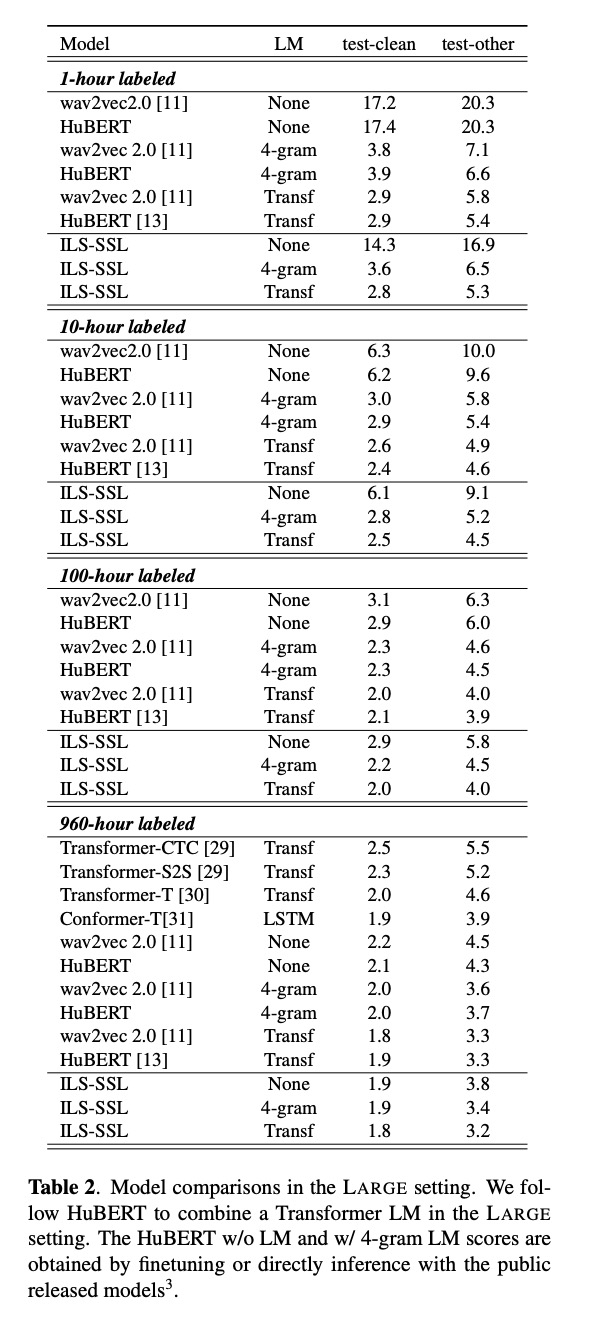 本文实验模型base model (95M parameters)使用960-hour LibriSpeech corpus ,big model (300M parameters)使用60,000-hour unlabeled audio from LibriLight。微调阶段使用以下数据 Libri-light 1 hour, 10 hour splits , LibriSpeech train-clean-100 subset and LibriSpeech 960-hour full dataset. Table 1为base model上的结果,在有无语言模型情况下,本文的ILS_SSL方案的识别WER都是最低。table 2是在big model 上结果亦是如此。图2为每层特征相关性,可知本文的方案在较低层高于HuBERT。table3验证在说话人相关任务和内容相关任务的表现。其任务包括 Speaker Identification (SID), Automatic Speaker Verification (ASV), Speaker Diarization (SD), Phoneme Recognition (PR), Automatic Speech Recognition (ASR), Keyword Spotting (KS), Query by Example Spoken Term Detection (QbE), Intent Classification (IC), Slot Filling (SF), Emotion Recognition (ER). 由结果可知,内容相关的任务性能得到提升,说话者相关的性能有所下降。table4和table5对本文的其它设计进行对比试验。