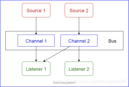 该模式主要处理组件,有4个重要的组件:事件源、事件侦听器、通道和事件总线。事件源将消息发送到事件总线上的特定通道,侦听器会订阅特定的频道。当消息发送到频道中后,订阅该频道的侦听器会收到该消息的通知。