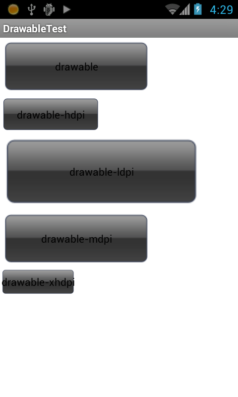 这是一个测试例子,手机分辨率都是480*800,这些都是Button,设置的背景都是同一个图片的copy,分别放在不同的drawable上当里的效果。资料文件的是205*77的图片,并且button的高一宽都是使用的wrap_content也是传说中的内容自适应。但是显示出来效果是不一样的。只能有人会说我看到了区别,但我还是不知道怎么放,ok。这个也是有讲究的。