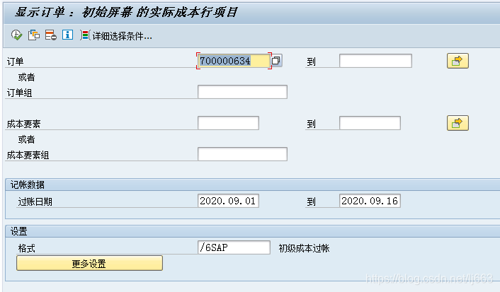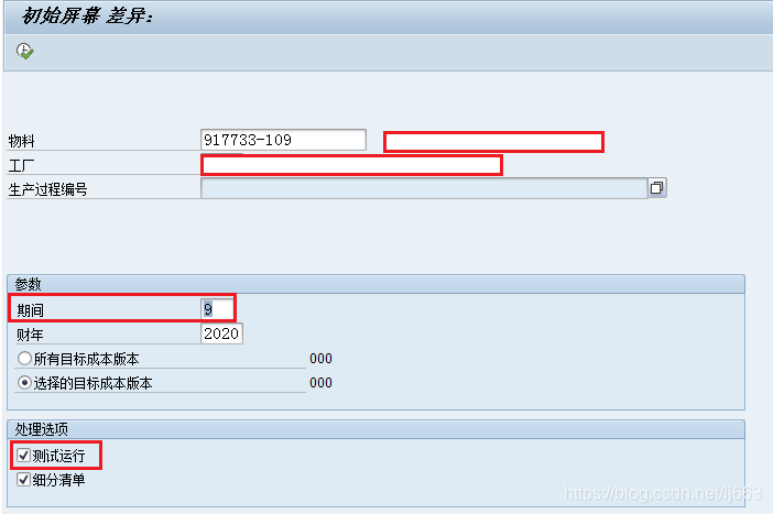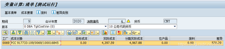 通过事务KKS6计算本月单个差异值。这里需要输入物料号,不是成本收集器订单。但两者都是有对应关系的。勾选测试运行。