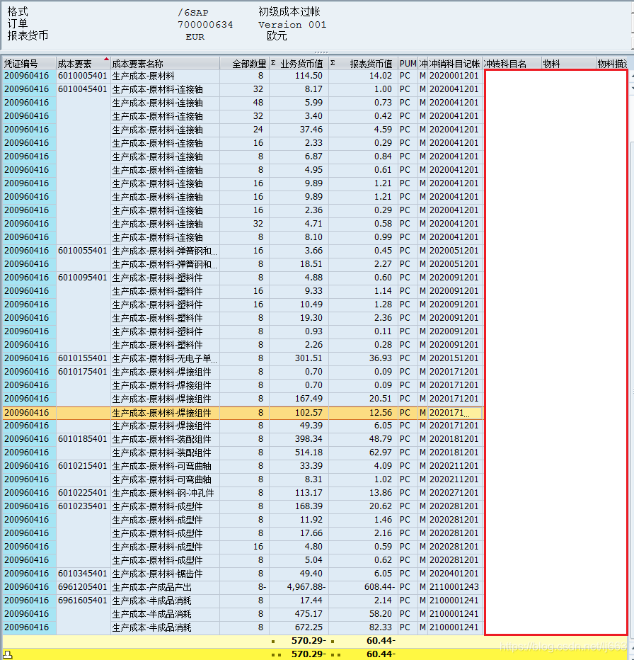 最后,从KOB1清单中可以看出,其金额为负值的对应产成品的产出。其金额为正值的对应产成品下级原材料及半成品的消耗及人工和机器工时消耗。所以,在网上查阅资料也显示。KKS5/KKS6是用于计算生产订单(本例中是成本收集器订单)投入产生差异。