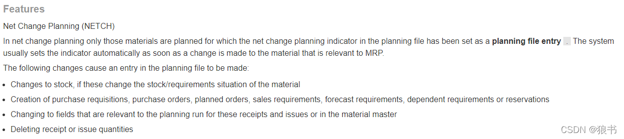 在MRP的运行机制中,不同的处理代码有着不同的控制逻辑。其中有一条是,净变化规划(NETCH)或规划期内的净变化规划(NETPL)。系统仅计划自上次计划运行以来与MRP相关的变更的物料。那么用户有必要弄明白MRP相关变更指的到底是哪些变更?笔者也寻找到了SAP Documentation中的说明截图如下: