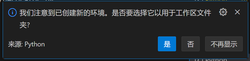 2、打开 VSCode,然后打开包含虚拟环境的文件夹,这时VSCode会自动识别出新的虚拟环境,询问你是否设置它。