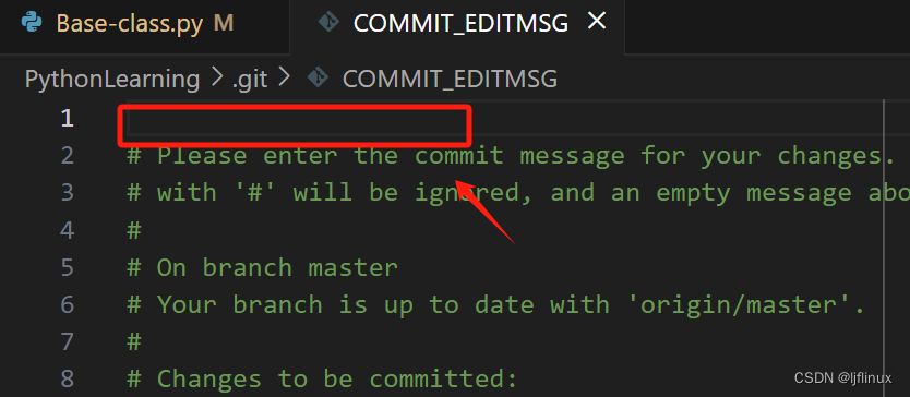 VSCode会弹出COMMIT_EDITMSG窗口,提示输入代码提交的备注说明: