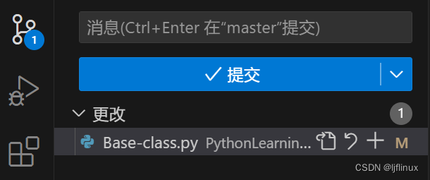 完成以上命令后,在Git管理的目录下创建.py程序文件,编辑程序文件并保存后,左侧“源代码管理会有提示”,这时候可以提交并同步代码: