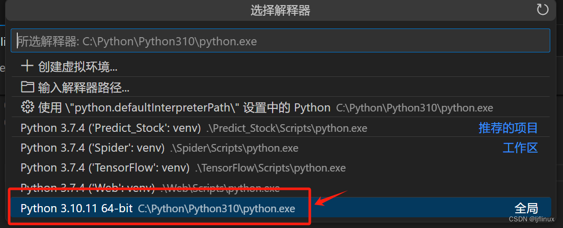 4、输入并选择 Python: Select Interpreter,然后从列表中选择你的虚拟环境解释器,如果你安装了多个不同版本的Python,可以选择对应的版本。