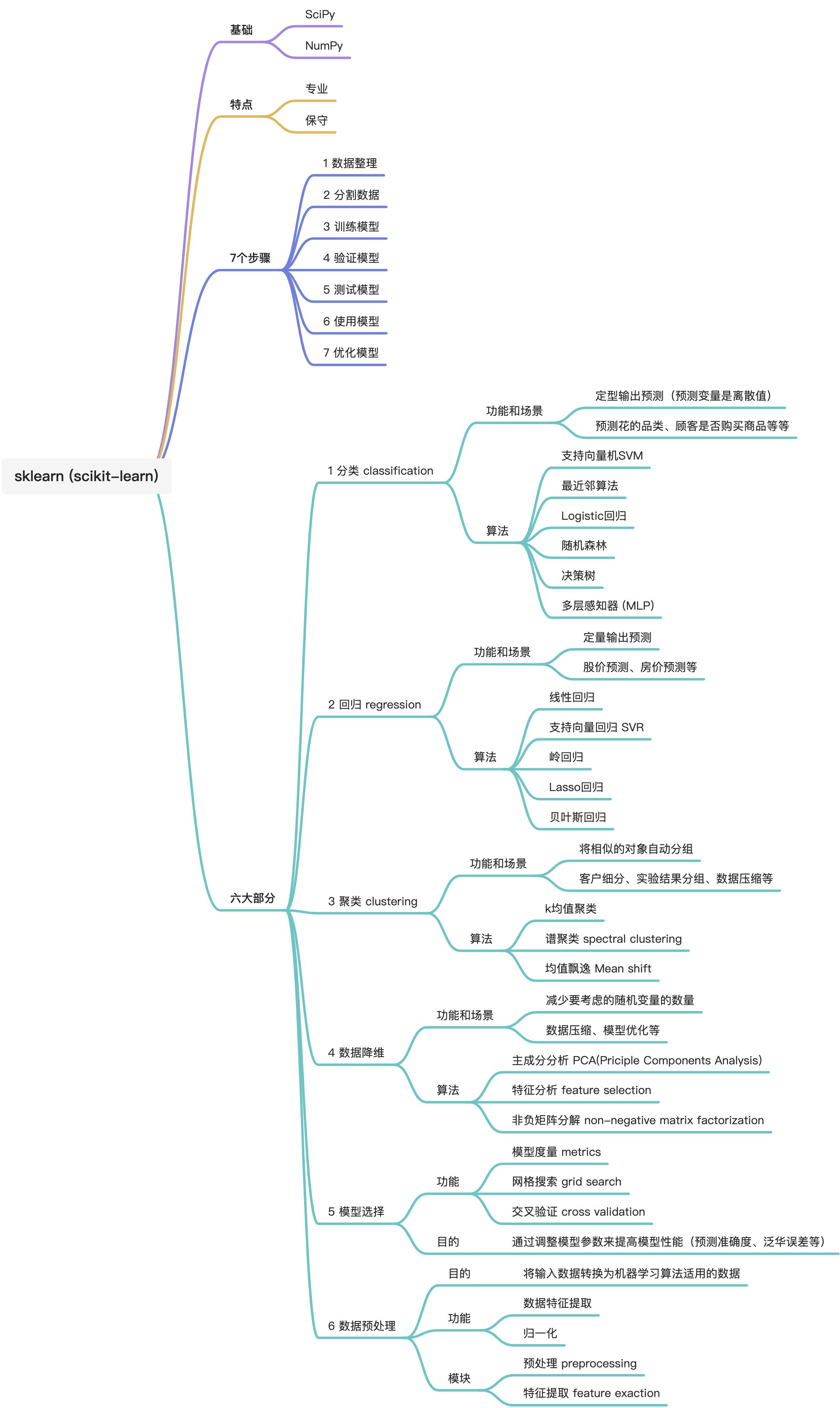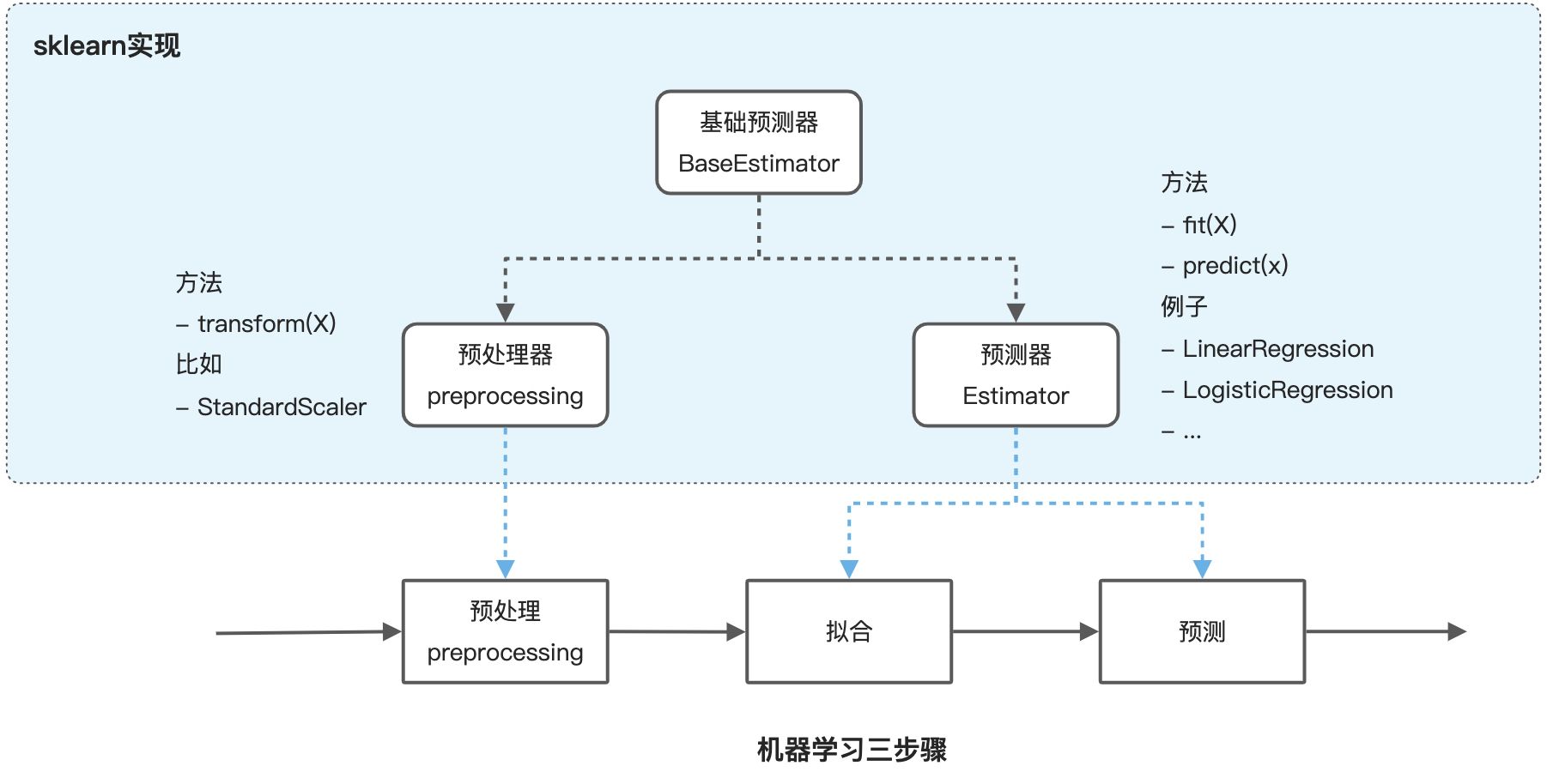 sklearn中内置了常用的机器学习算法和模型,以及基本的预处理方法。分别由**预测(估计)器(estimator)和预处理器(preprocessing)**实现,并且它们继承自同一个基础预测器。