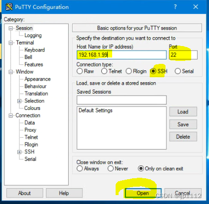 打开putyy软件-》输入群晖的IP地址,确认端口号,连接类型选择SSH-》最后按OPEN
