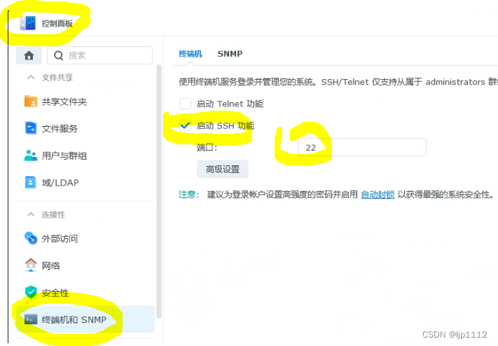 控制面板-》终端机和SNMP-》启动SSH功能(打勾)-》然后按应用按钮