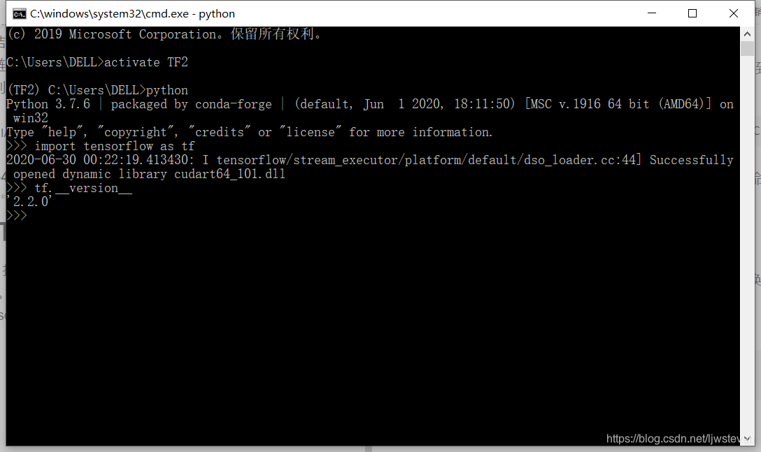 win + r 输入cmd,打开dos窗口。首先我们创建tensorflow 2的虚拟环境:输入命令,虚拟环境起名叫 TF2 ,python版本 3.7