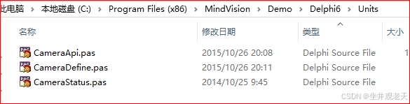 要说明的是3个单元文件,这三个单元文件就是C++里头文件转换而来的,其中CameraApi.pas就是包装了