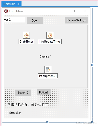 功能简介:打开枚举到的相机如果名称一致就打开知道相机,否则打开第一个相机;打开后显示图像在窗口中间TPanel上;可以打开相机的属性设置窗口调节参数;可以放大、缩小图像。
