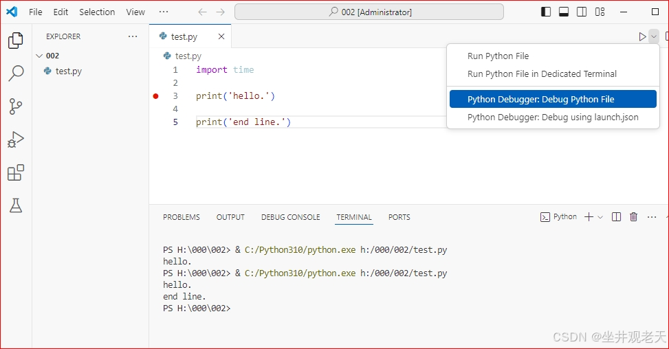 调试Python脚本,代码编辑器里,左侧可以下断点,运行按钮下来有调试python脚本的
