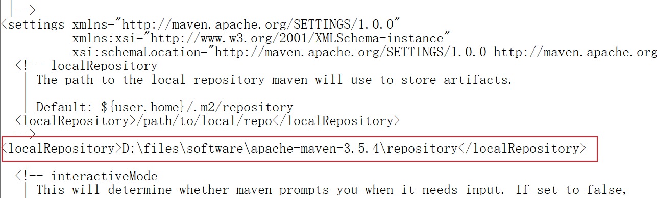 找到节点localRepository,在注释外添加<localRepository>D:\files\software\apache-maven-3.5.4\repository</localRepository>