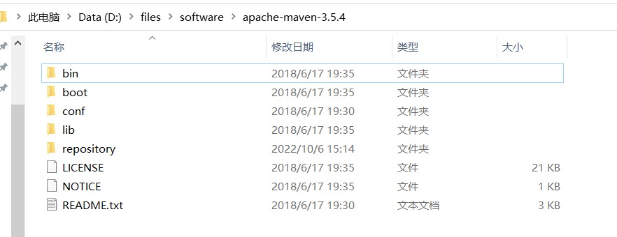 下载完成后,解压到某一路径下。我是放到了我的D:\files\software\apache-maven-3.5.4,实际配置环境变量时以自己安装的路径为准。