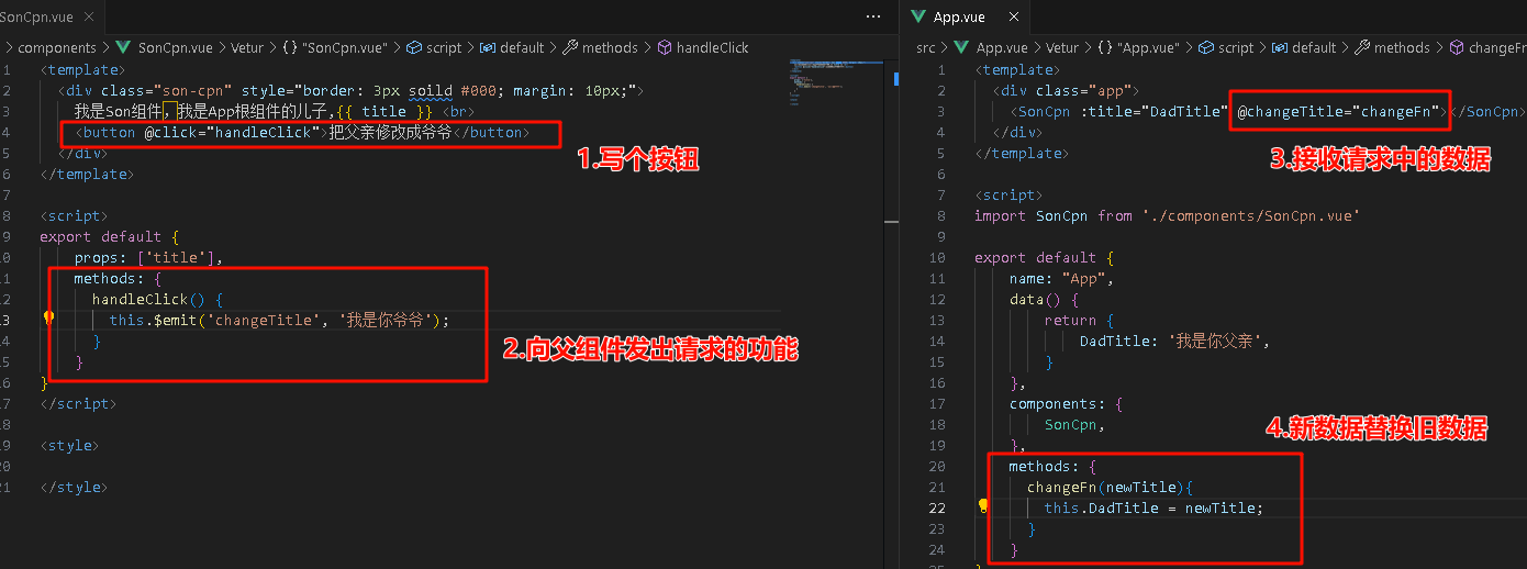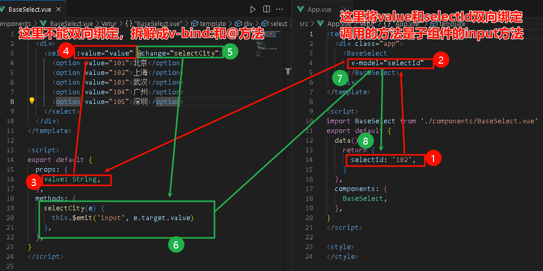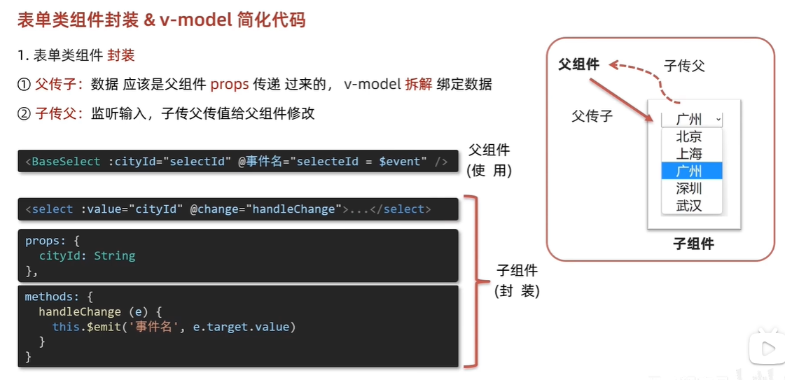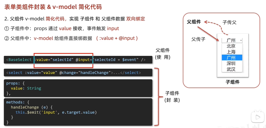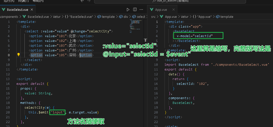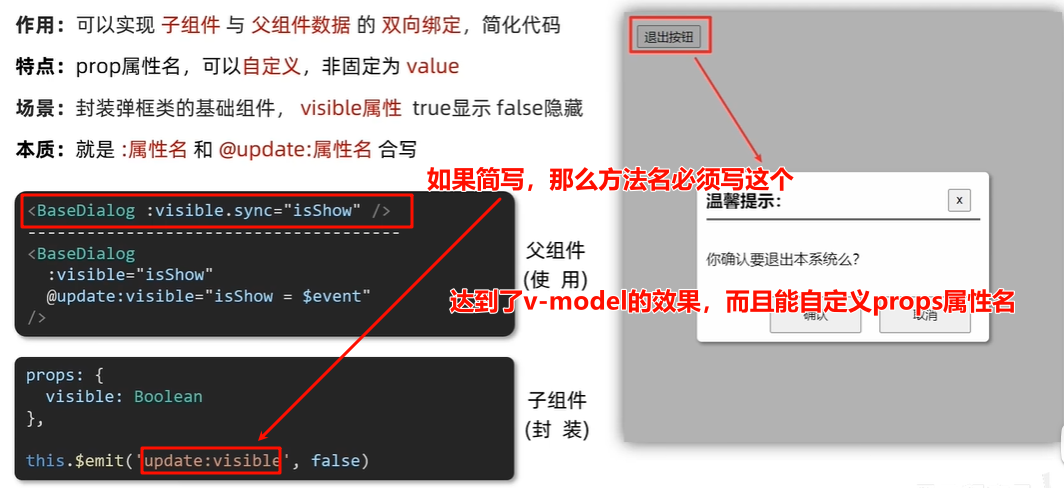 上面使用v-model简写,虽然能实现父子组件双向绑定,但是简写方法的props属性名必须是value,明显不合适,无语义