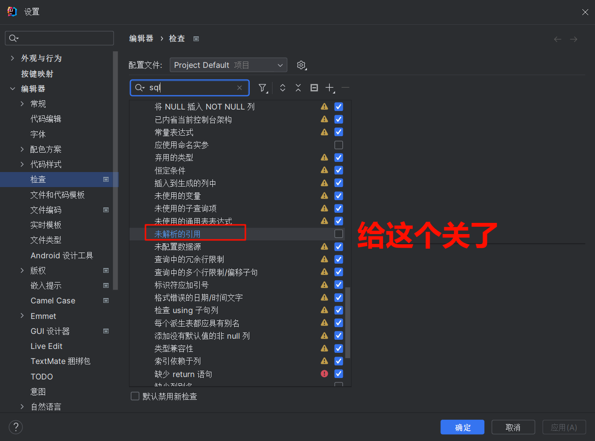 不是检测有问题吗,那就将idea的检测问题取消掉或者修改检测问题等级,根本问题上我们写的sql语句是一个字符串传过去,只要在mysql查询语句能够正确执行,不要这种检测也罢。