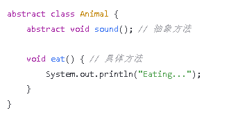abstract关键字定义。 - 可以包含抽象方法(没有实现的方法)和具体方法(已经实现的方法)。