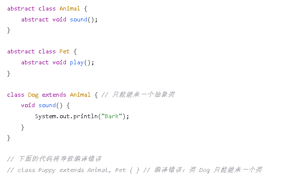 - 一个类只能继承一个抽象类(单继承)。这意味着在一个类的定义中,不能同时继承多个抽象类。