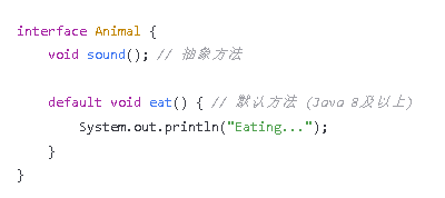 interface关键字定义。 - 只能包含抽象方法(Java 8之前),自 Java 8 起,可以包含默认方法和静态方法,但不能有实例变量。