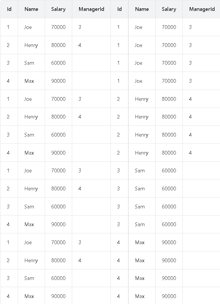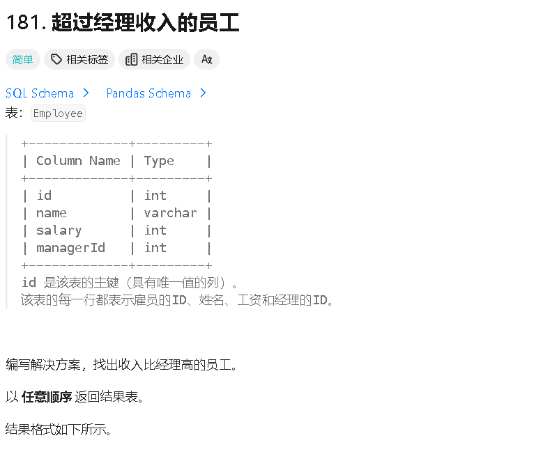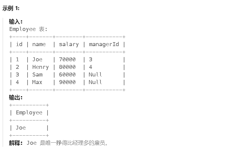 看得出这个题目自连接的效率不如内连接,毕竟要重复扫描一个表,也比内连接的逻辑复杂,要考虑表自身的关联关系