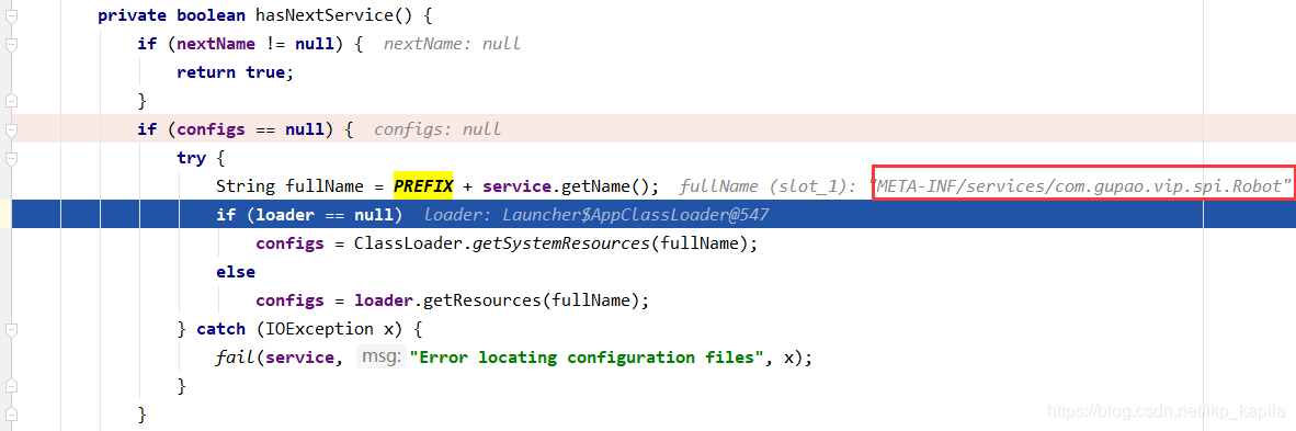 private static final String PREFIX = "META-INF/services/";load方法只是加载生产ClassLoader初始化类加载器,当迭代器迭代时,此时会进行配置文件加载,进行反射生成实例。