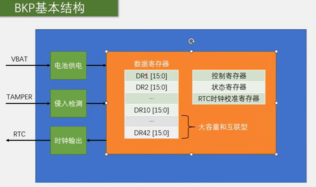 BKP备份寄存器和Flash存储器类似,Flash的数据是真正的掉电不丢失,而BKP的数据,是需要VBAT引脚接上备用电池来维持的