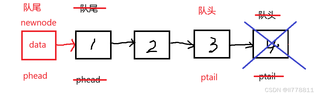 这样的话以链表头部为队头,插入数据时无需通过遍历就可以直接找到队尾,使入队列与出队列操作时间复杂度均为O(1)。