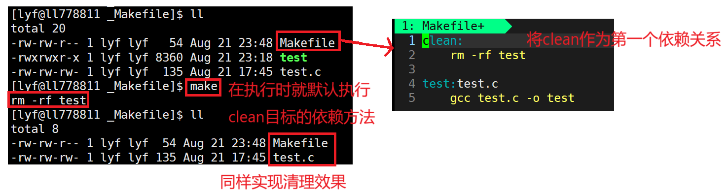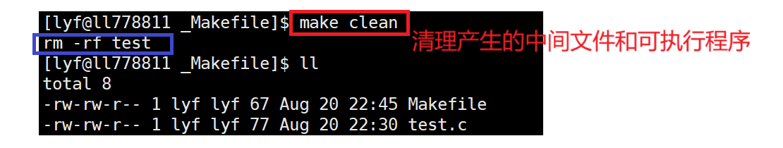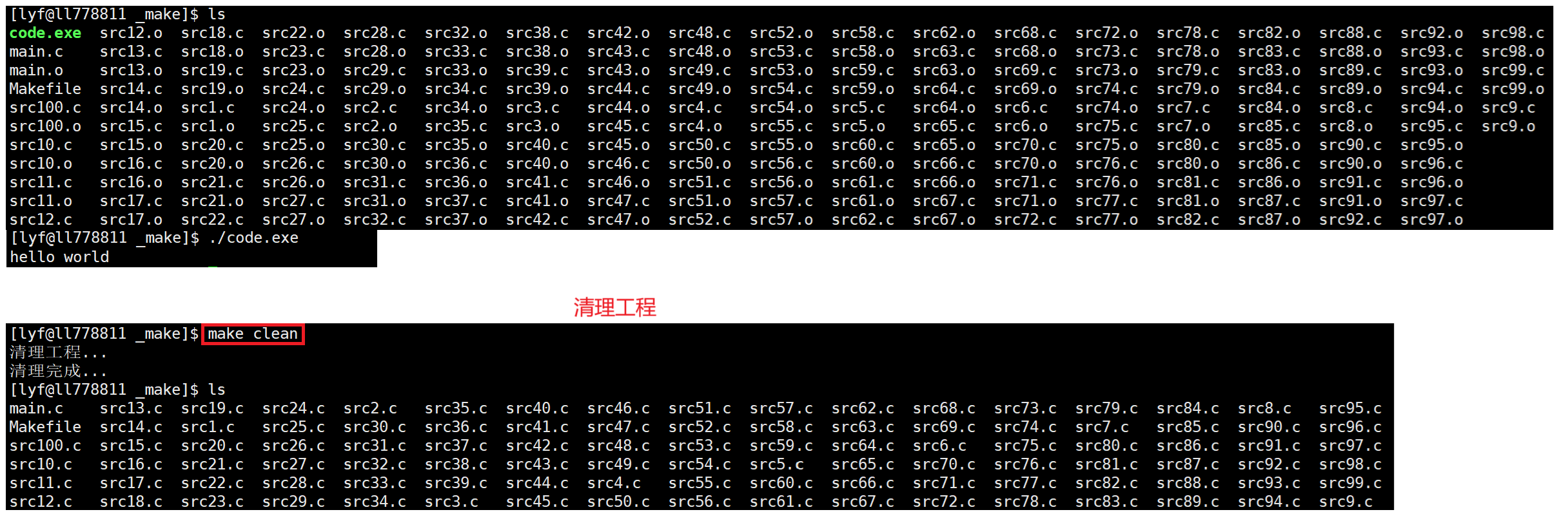 make命令的后面可以跟目标名,后面跟哪个目标就解析谁的依赖关系和依赖方法,所以make clean只是创建了一个没有依赖列表的clean目标,利用了make的自动化推导能力,让其选择性执行rm命令,在构建工程的角度,看起来就是清理项目,本质就是删除不需要的临时文件