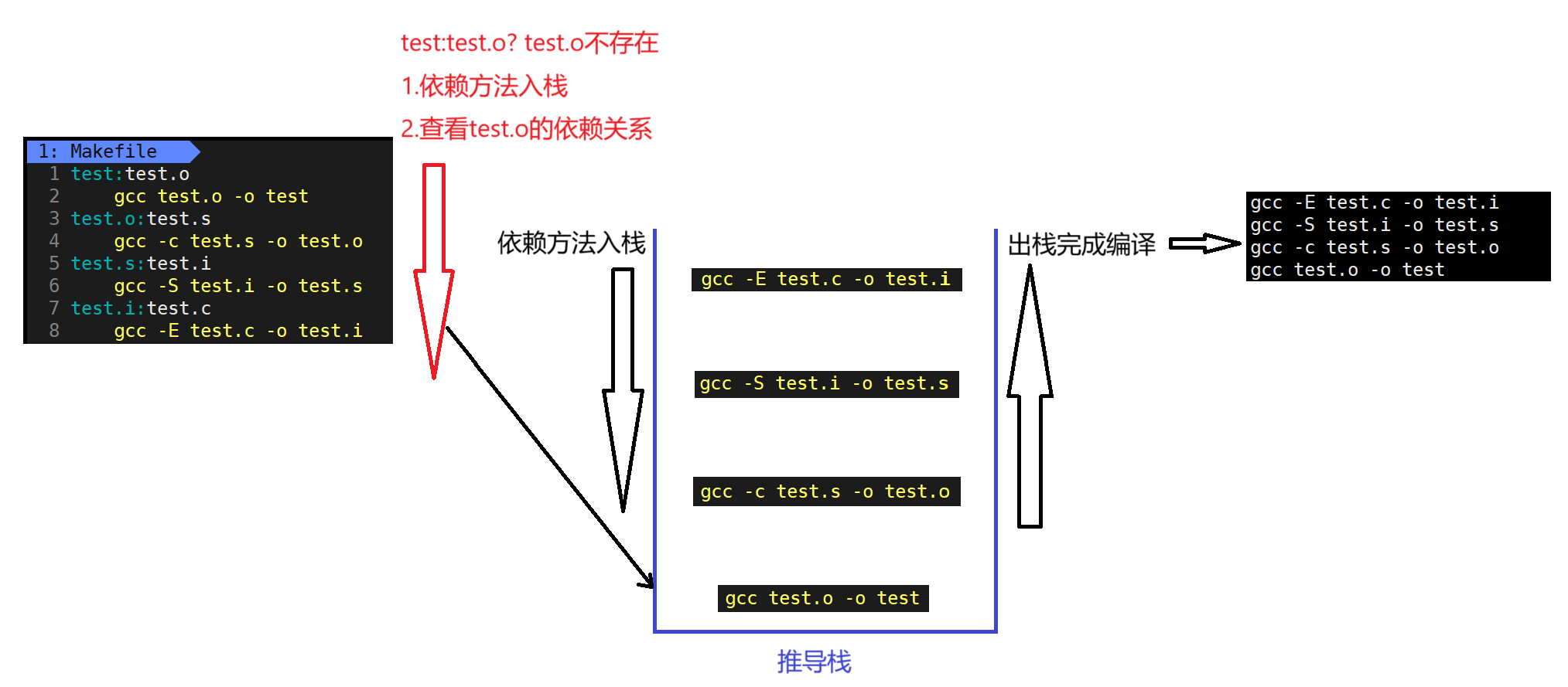 这是因为,要得到test必须要依赖test.o,但是当前目录下没有test.o这个文件,但是makefile文件中有得到test.o的方法,但是,要得到test.o又必须依赖test.s,但当前目录下依旧没有test.s,以此类推,要先得到test.i文件,才能得到test.s文件,然后才能得到test.o文件,最后才能得到test,所以实际指令的执行顺序,于我们在makefile文件中写入的,是反过来的