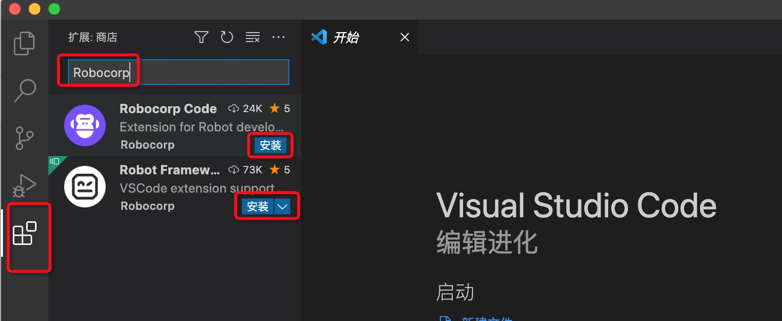 点击左边栏最下面扩展菜单,在搜索框中输入"Robocorp",在下拉框中中安装Robocorp Code