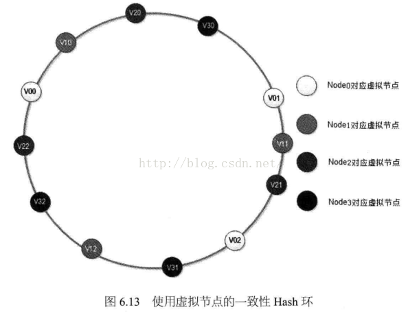 在图6.13中,新加入节点NODE3对应的一组虚拟节点为V30,V31,V32,加入到 —致性Hash环上后,影响V01, V12, V22三个虚拟节点,而这三个虚拟节点分别对应 NODE0 NODE1, N0DE2三个物理节点。最终集群中加入一个节点,但是同时影响到集群中已存在的三个物理节点,在理想情况下,每个物理节点受影响的数据量 为其节点缓存数据最的1/4(X/(N+X)),N为原有物理节点数,X为新加入物理节点数),也就是集群中已经被缓存的数据有75%可以被继续命中,和未使用虚拟节点的一致性Hash算法结果相同,只是解决的负载均衡的问题。